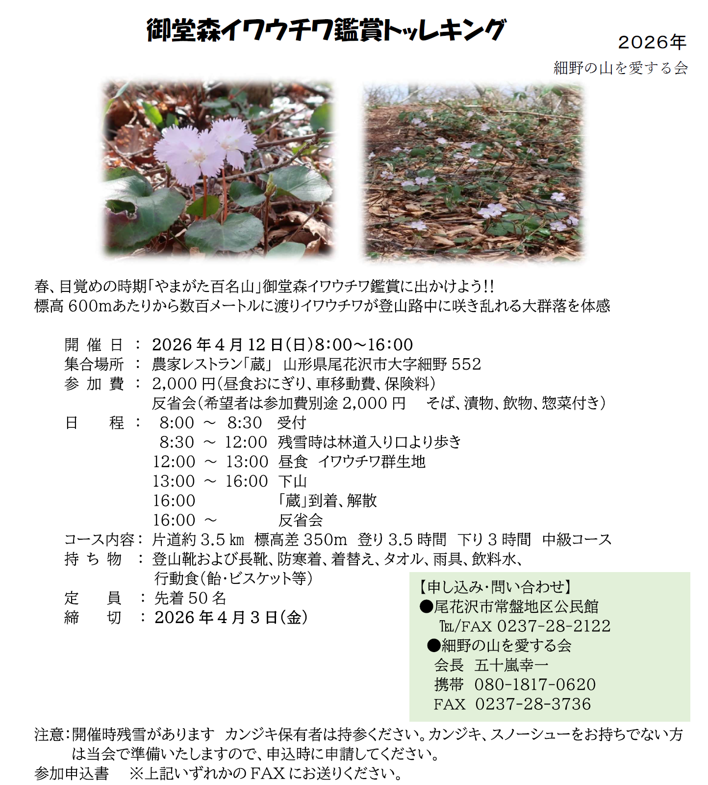 ◇ ご注意 開催時残雪があります。カンジキ保有者は持参、カンジキ、スノーシューズをお持ちで無い方は当会で準備しますので、申込時に申請をしてください。